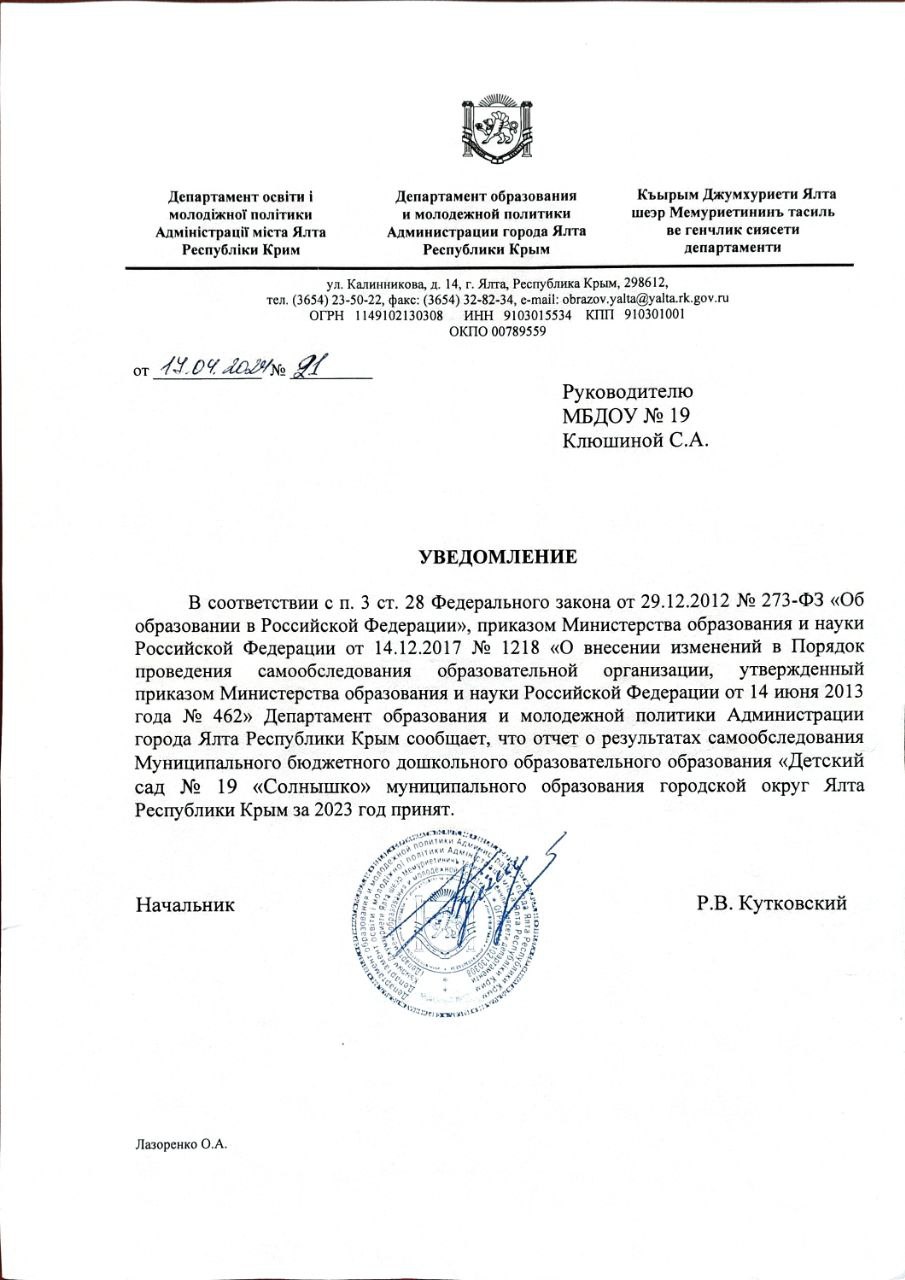 Муниципальное бюджетное дошкольное образовательное учреждение «Детский сад № 8» «Солнышко» муниципального округа город-курорт Ялта Республики Крым